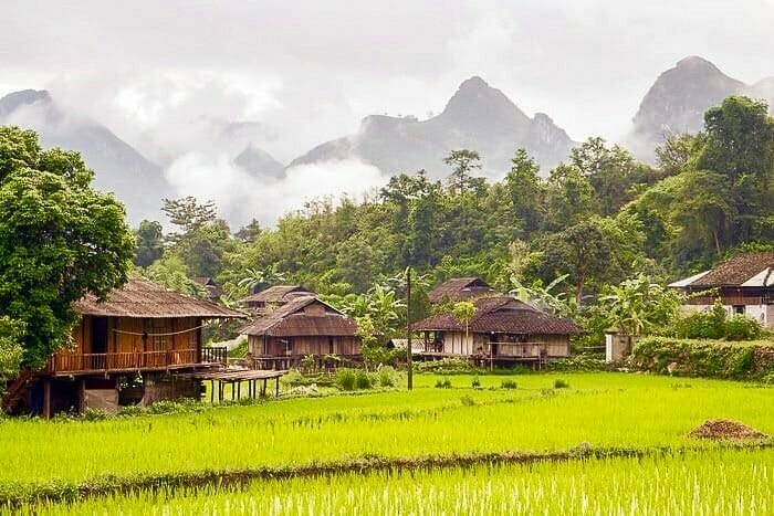 The village of Du Gia is nestled amidst lush green mountains and terraced rice fields. The landscape is dotted with traditional stilt houses and small hamlets, offering picturesque views that are a paradise for photographers and nature enthusiasts.